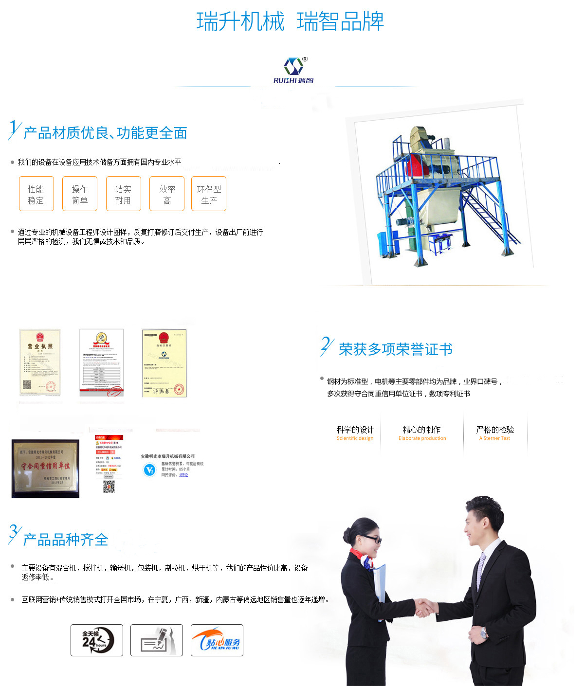 安徽瑞升機械制造有限公司坐落在明光市工業園區,本公司產品主要用于粉料物質,顆粒物質的混合、攪拌、輸送、包裝的自動化生產設備。工廠占地面積為1萬多平方現有6000平方米的生產車間和各類加工檢測設備,具備產品開發(fā)、研制、設計、生產、試驗、倉儲運輸等能力,可以生產多種規(guī)格、多種非標定制的產品,并有多項技術獲得國家專利,擁有自主進出口權,公司憑借優(yōu)良的技術、先進的工藝和科學的管理理念,所生產的產品已暢銷全國各地,部分產品已進入馬耳他、印度尼西亞、韓國、羅馬尼亞、沙特阿拉伯、馬來西亞、印度、巴基斯坦、等國家和地區,受到國內外客戶的高度認可和信賴。 本公司獲得守合同重信用單位證書,對原材料的采購極為細致,鋼材為標準型,電機等主要零部件均為品牌,數項專利證書。技術方面我司擁有一支國內的技術和管理團隊,在機械設備應用...公司資質榮譽
